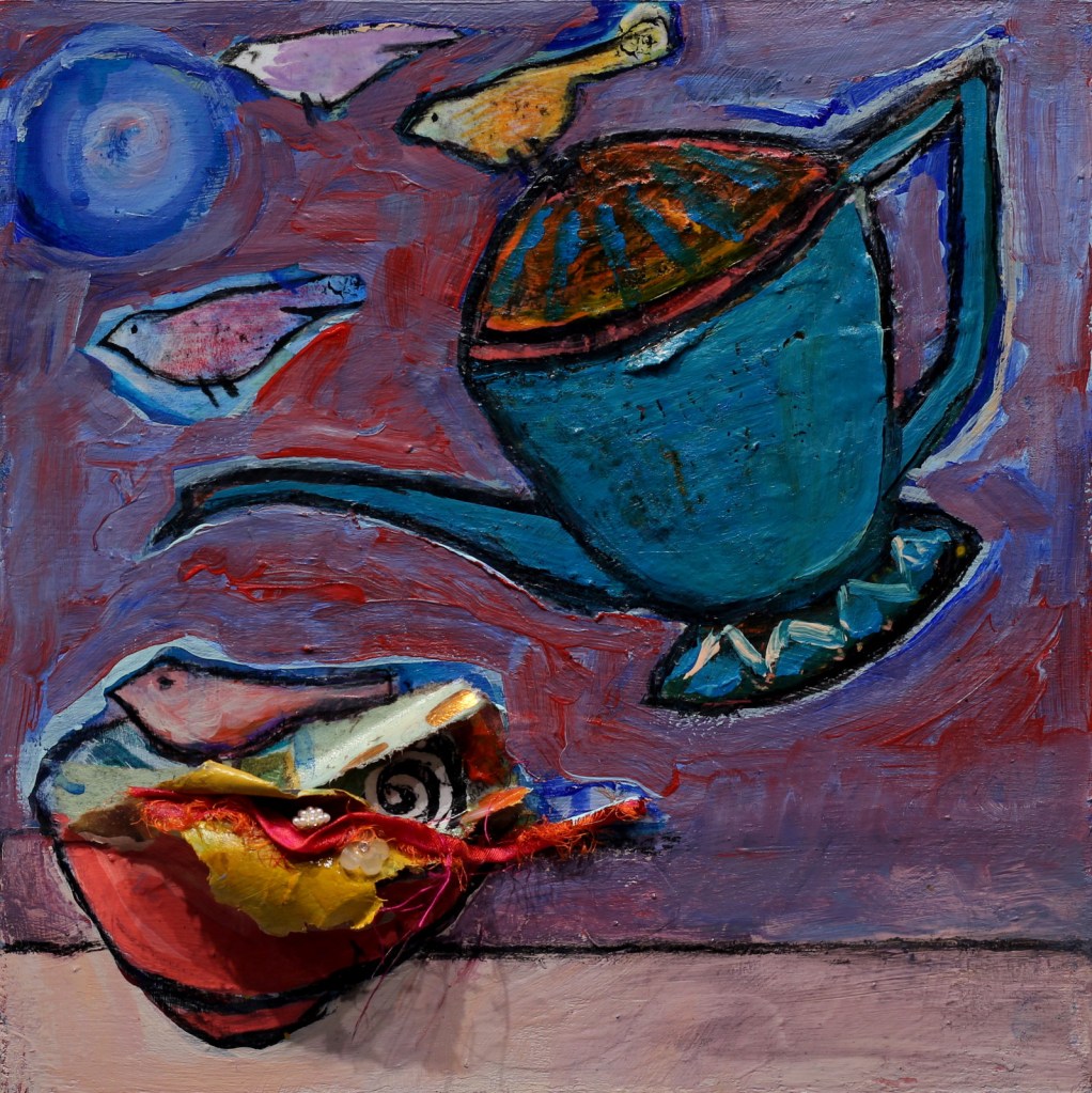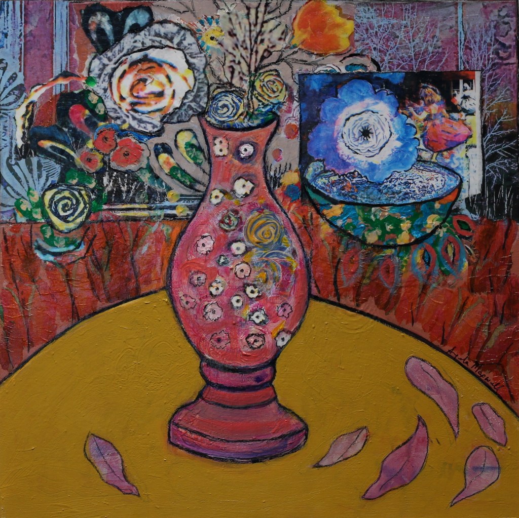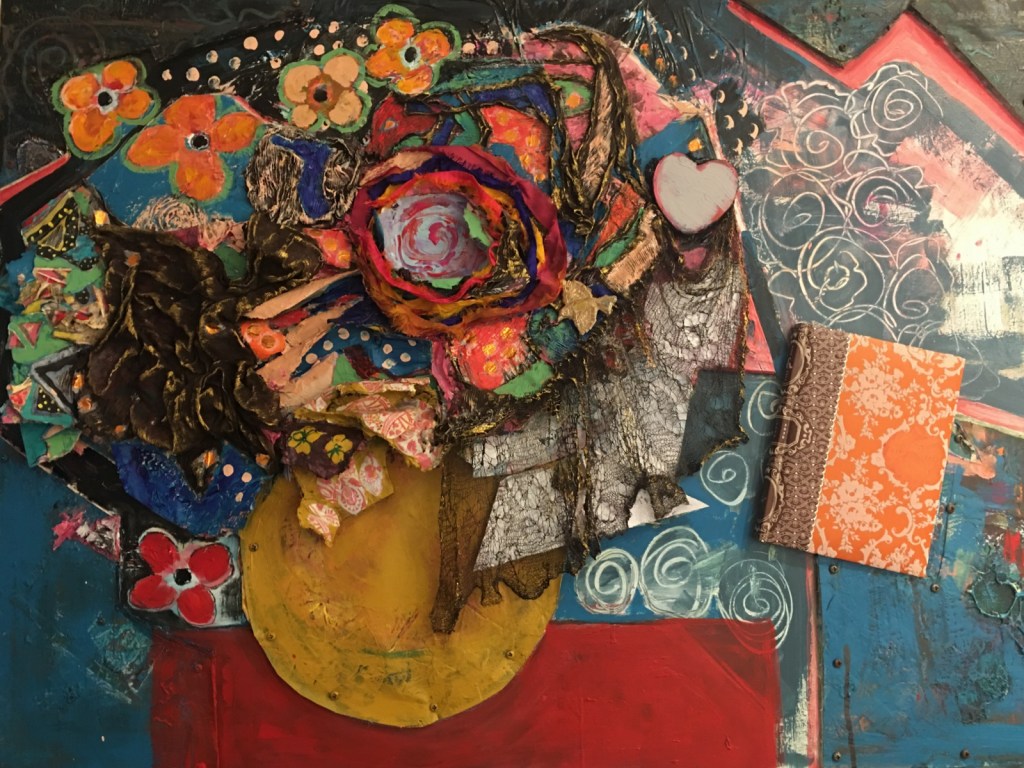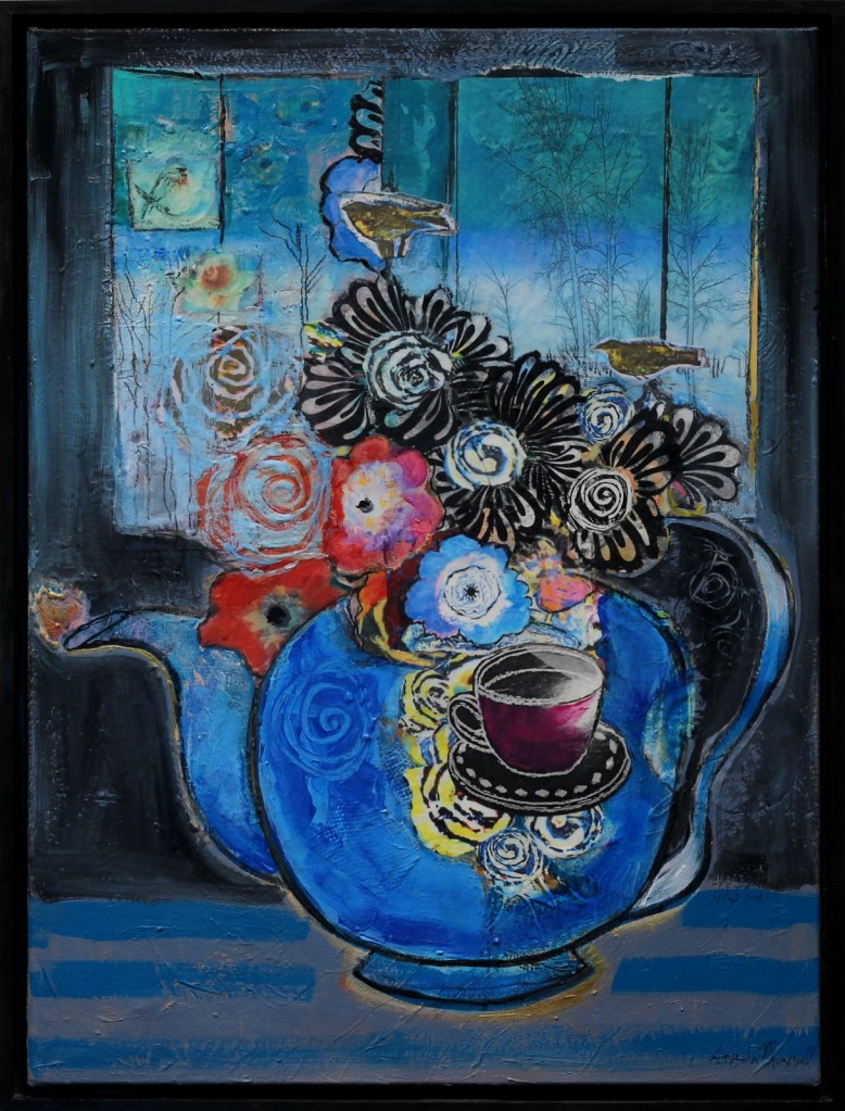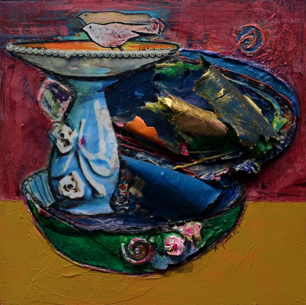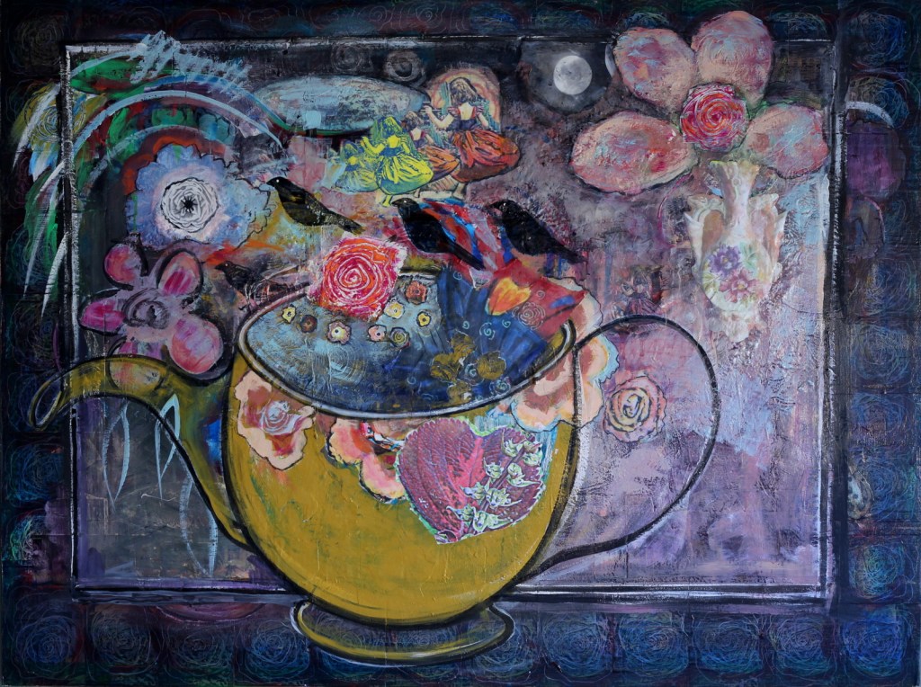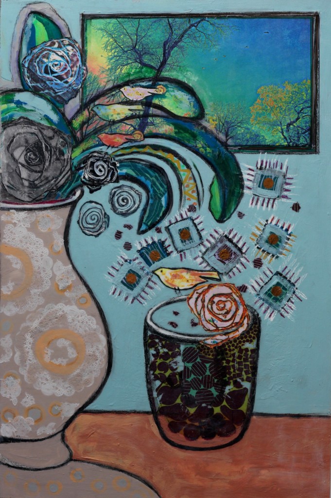 I often use everyday objects to draw the viewer in…bringing them into my own alternate universe where there is an abundance of colour and motion.  The collage technique further blurs the line between real and what is in my imagination.