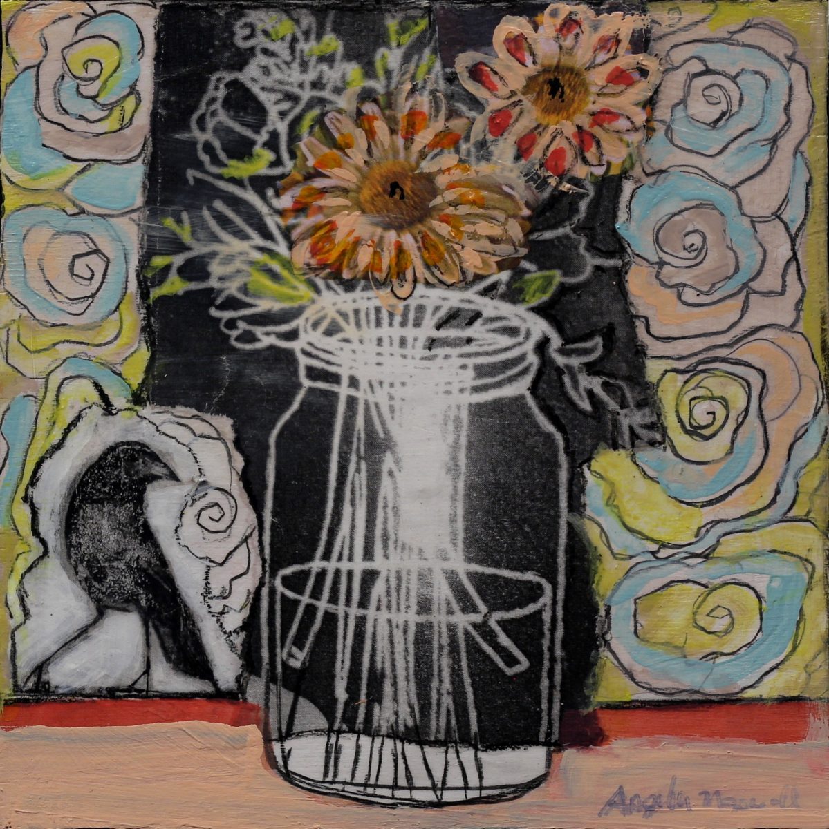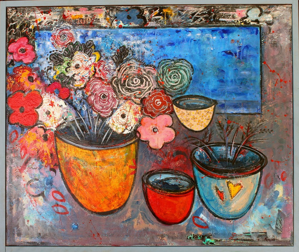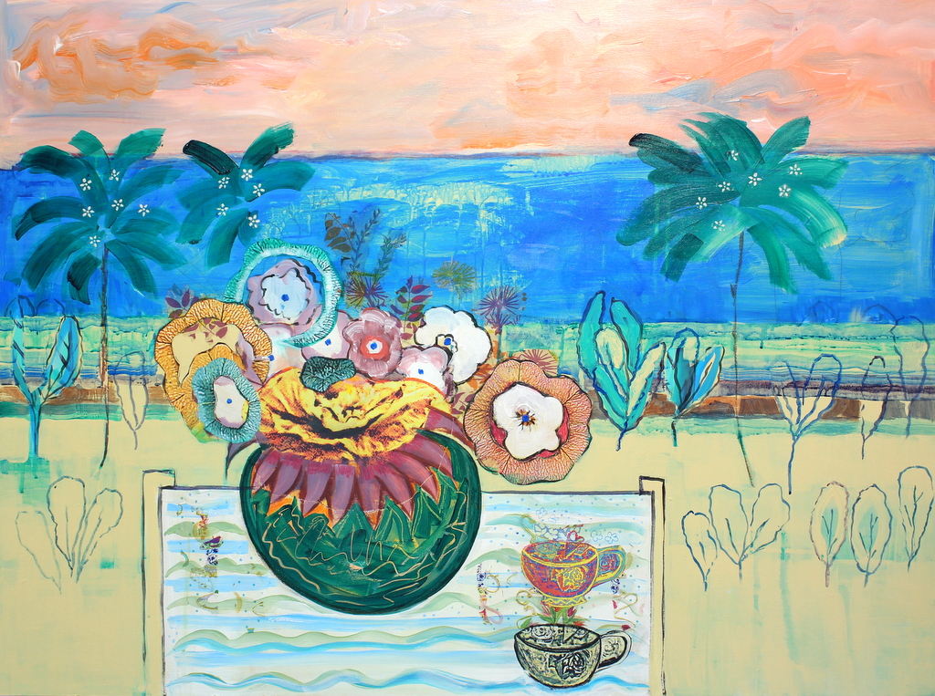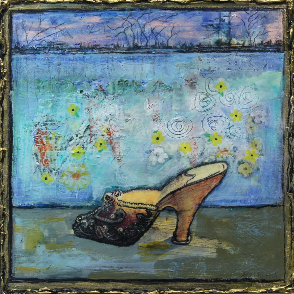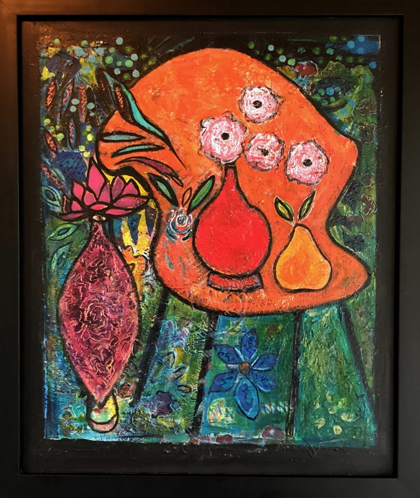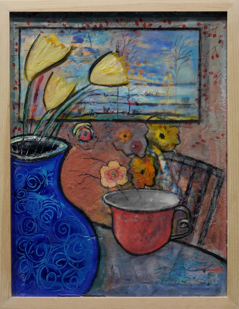 I often use everyday objects to draw the viewer in…bringing them into my own alternate universe where there is an abundance of colour and motion.  The collage technique further blurs the line between real and what is in my imagination.