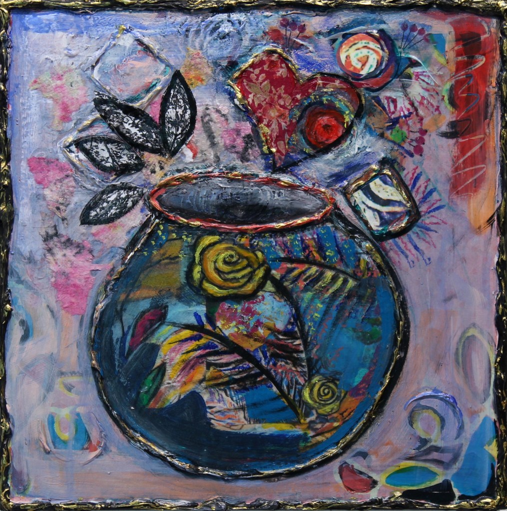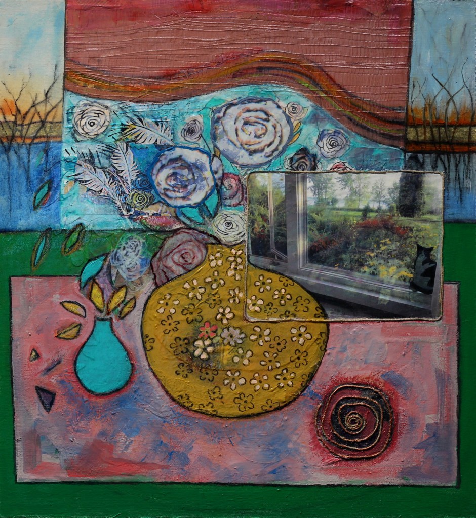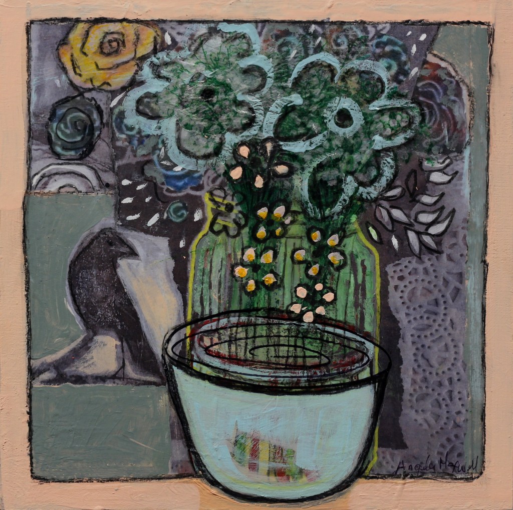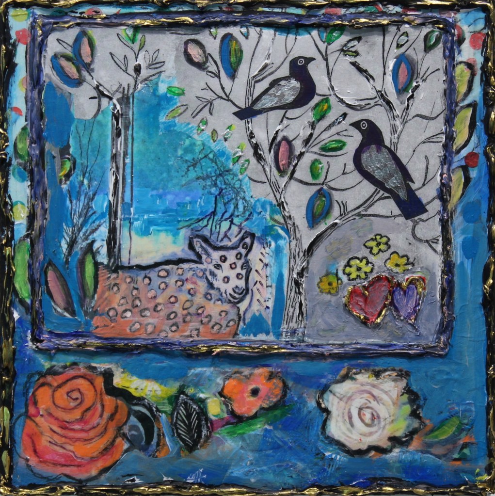 I experimented for a while with a minimal canvas, keeping a certain playfulness in the work. It wasn’t long before I was incorporating papier maché, fabric and texture, enjoying as I do the process of adding and subtracting, arranging and rearranging, layering my media, until I capture that special moment in time.