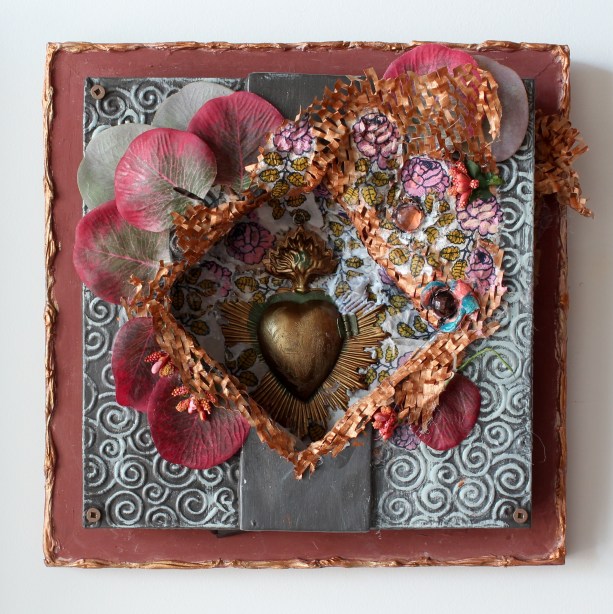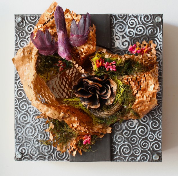 In my last exhibition I used old kitchen drawers as a vehicle for some new creations; I recently realized that these same drawers could house my new recycled treasures.  I like the synergy that these sculptures brought to my drawer paintings. This new process has added unexpected pleasure to a long winter.