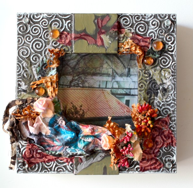 Another major influence is the child’s view of the world.  When I achieve it and I begin experimenting with mixed media, my sub-conscious flows freely, and so the journey begins.  It was in this frame of mind that I remembered some small drawers from an old bank languishing in my garden shed.  They seemed the perfect vehicle to carry my imaginary portrait and still life series – as did my old kitchen drawers, which were recently replaced.  Using photos, altered images, paint, paper, string, and gel, I created this series of vignettes as part of the Charmed I’m Sure illusion.